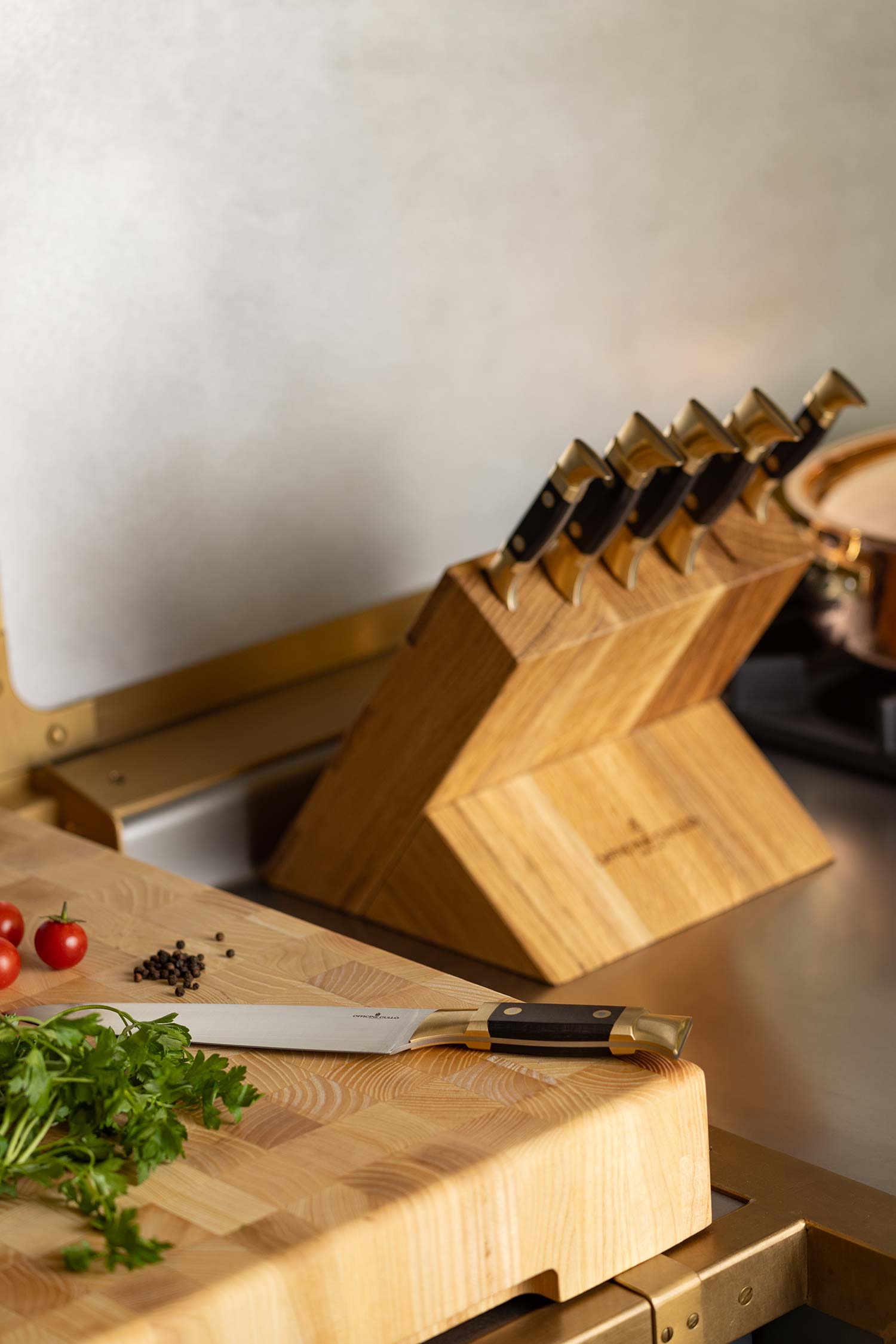 Il set di coltelli professionali di Officine Gullo è una testimonianza dei più alti standard di qualità e artigianalità. Realizzato a regola d’arte, ogni coltello combina eleganza e funzionalità per offrire un’esperienza culinaria senza pari.