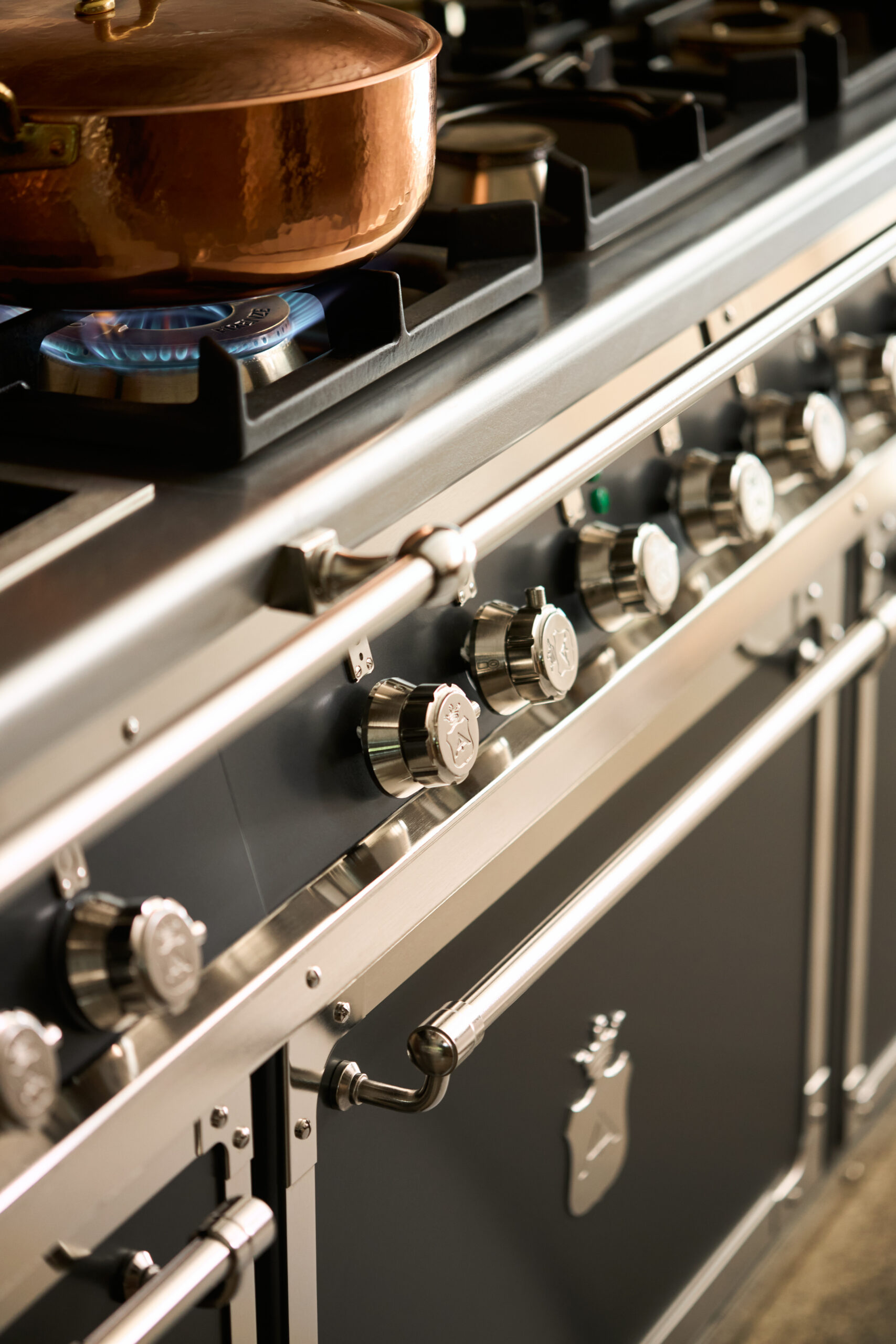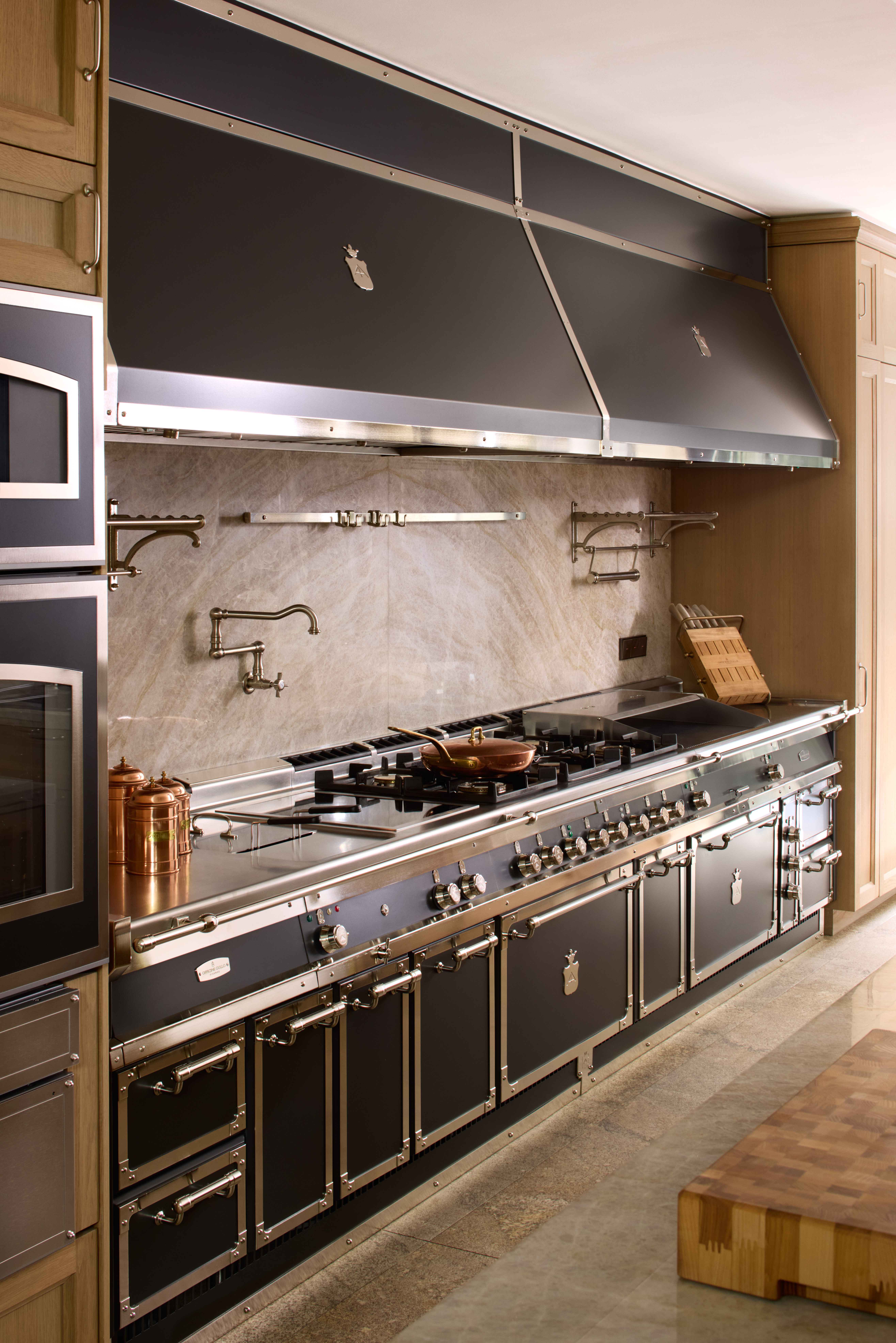 Macchina di cottura OG Professional con cuocipasta elettrico, piano a induzione Gaggenau, sei fuochi a gas, frytop liscio e rigato, forni statici e multifunzione; forno a vapore; forno multifunzione; cassetto sous-vide; cassetto scaldavivande.