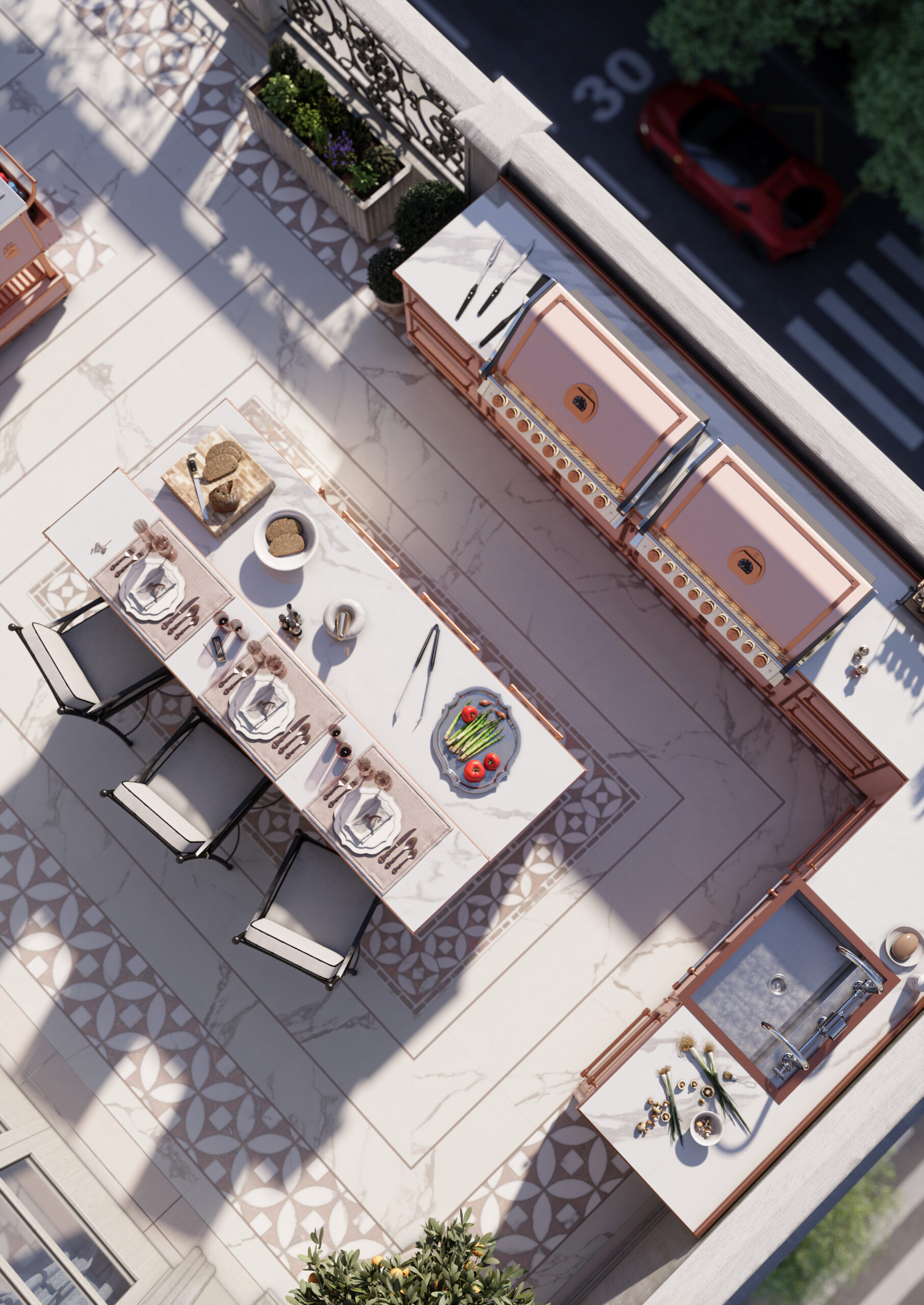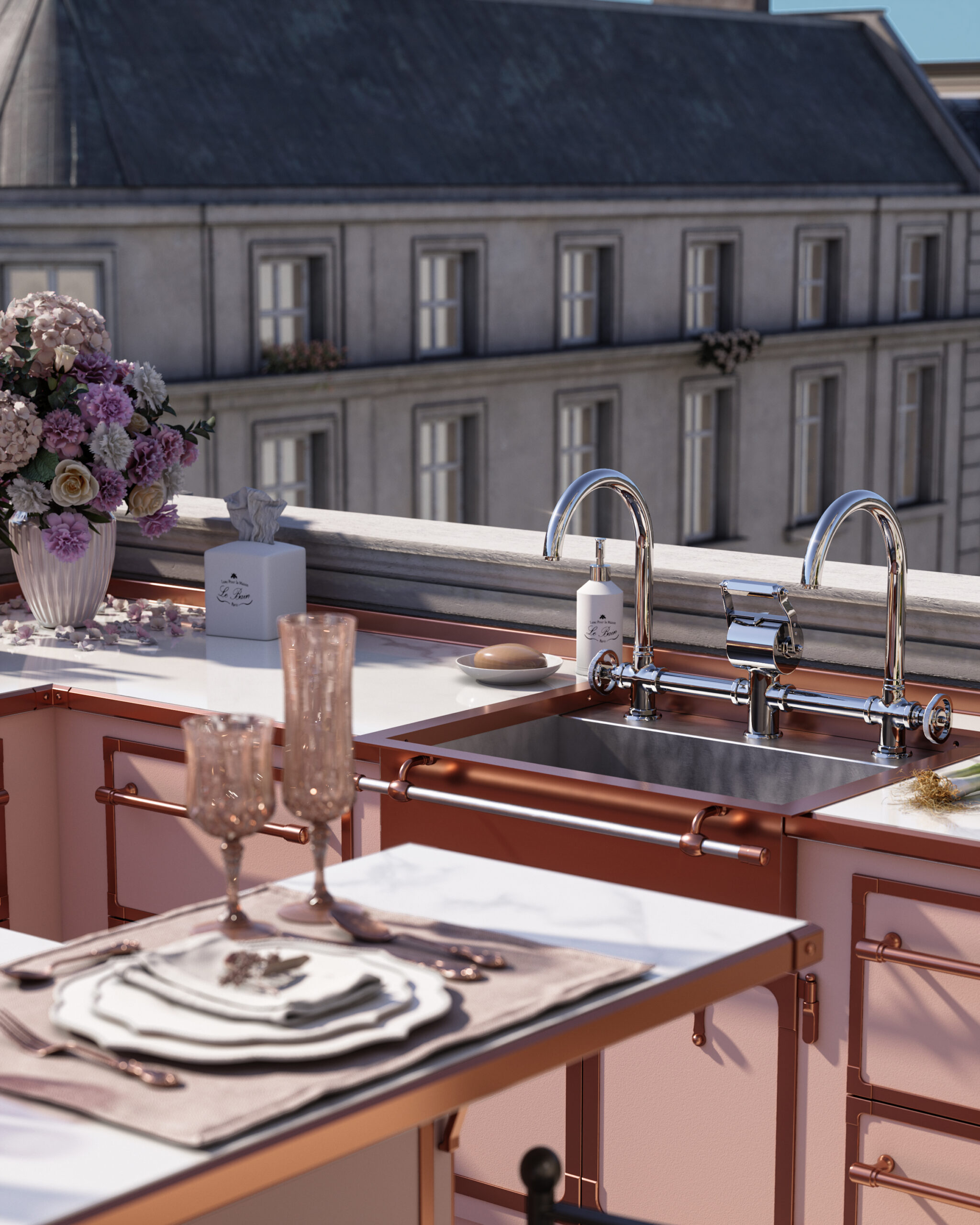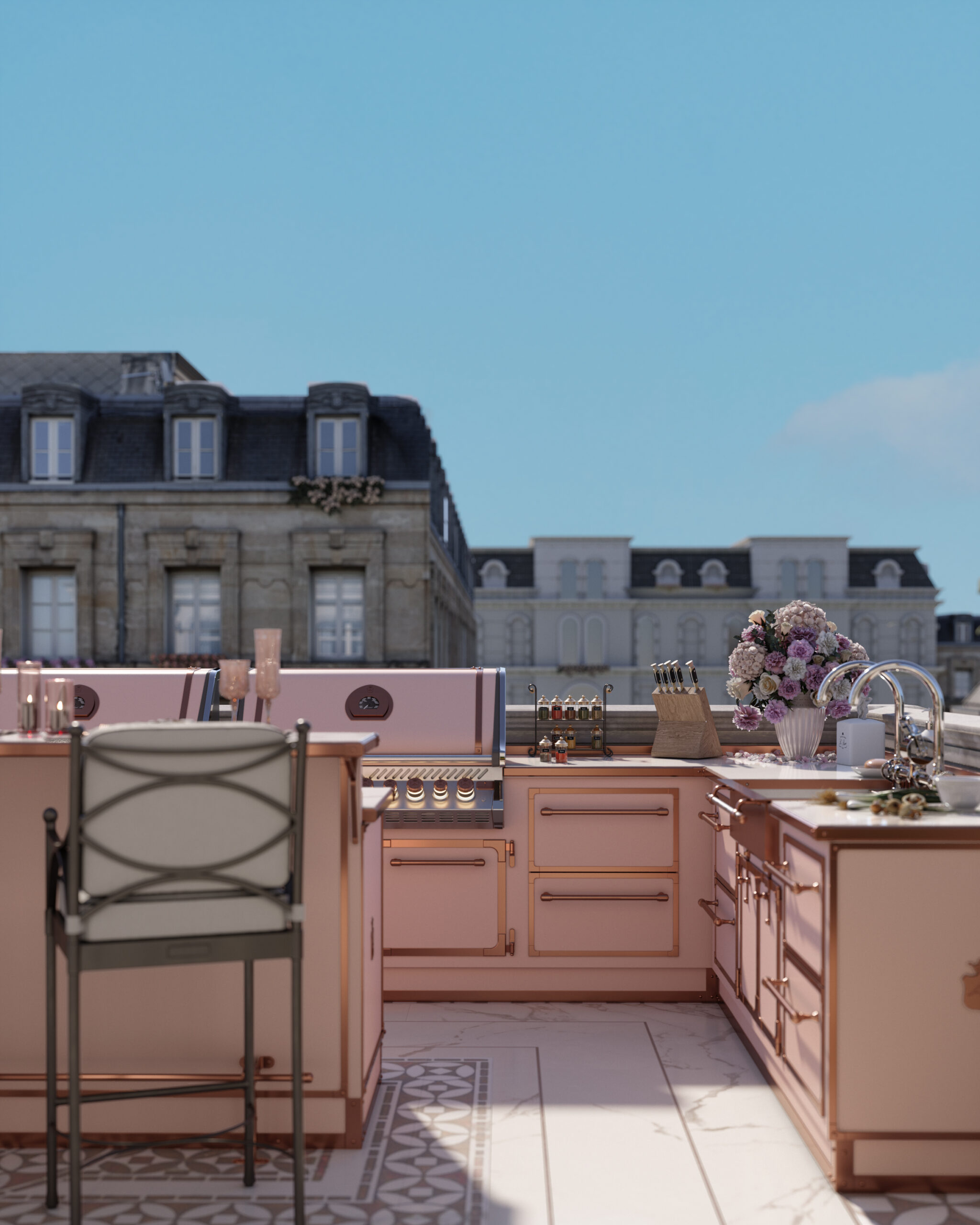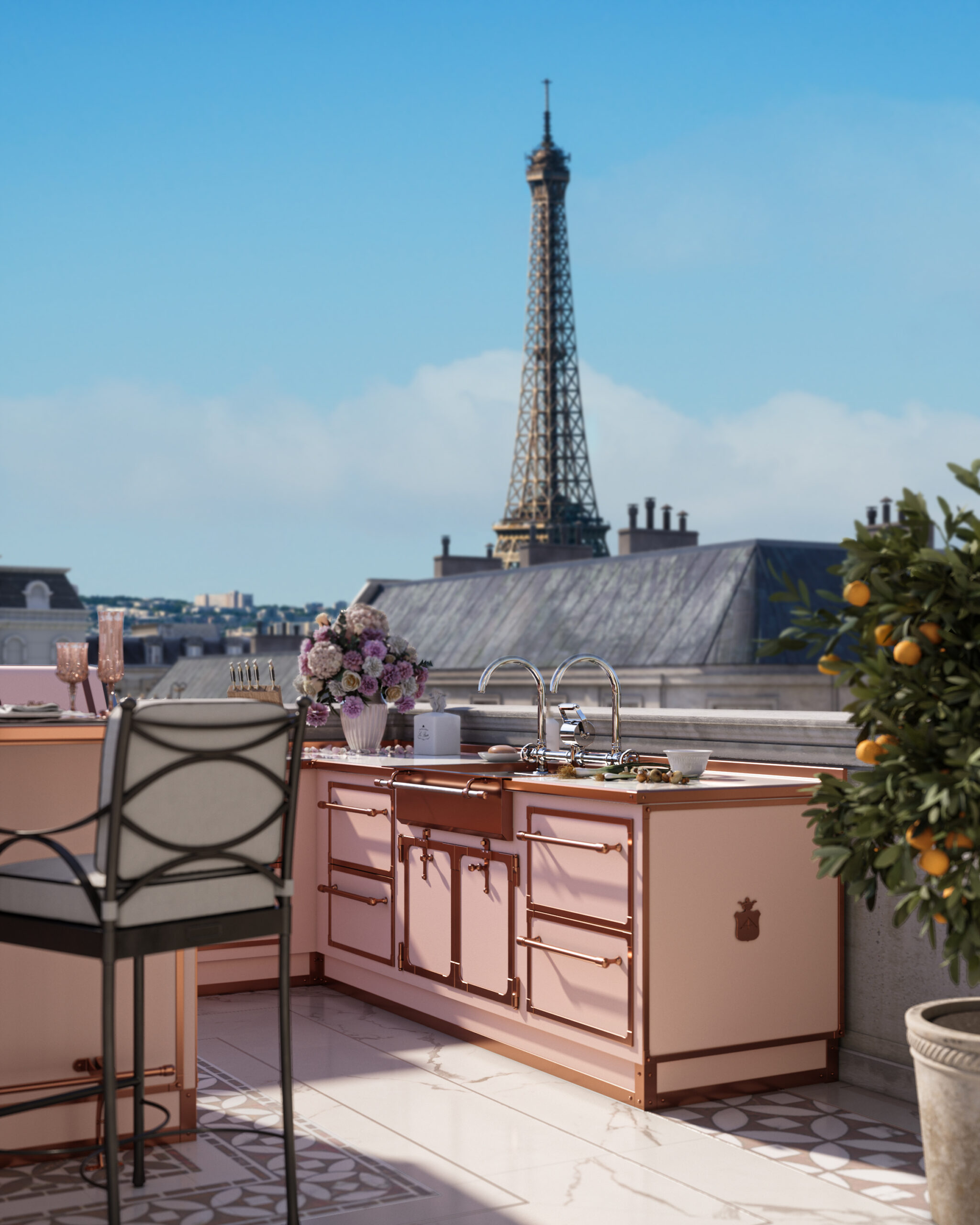 La cucina all’aperto guarda verso il panorama di Parigi, con la Torre Eiffel che entra naturalmente nella scena. Il progetto punta su equilibri chiari: marmo Statuario, contrasti leggeri e una finitura in rame che scalda l’insieme.