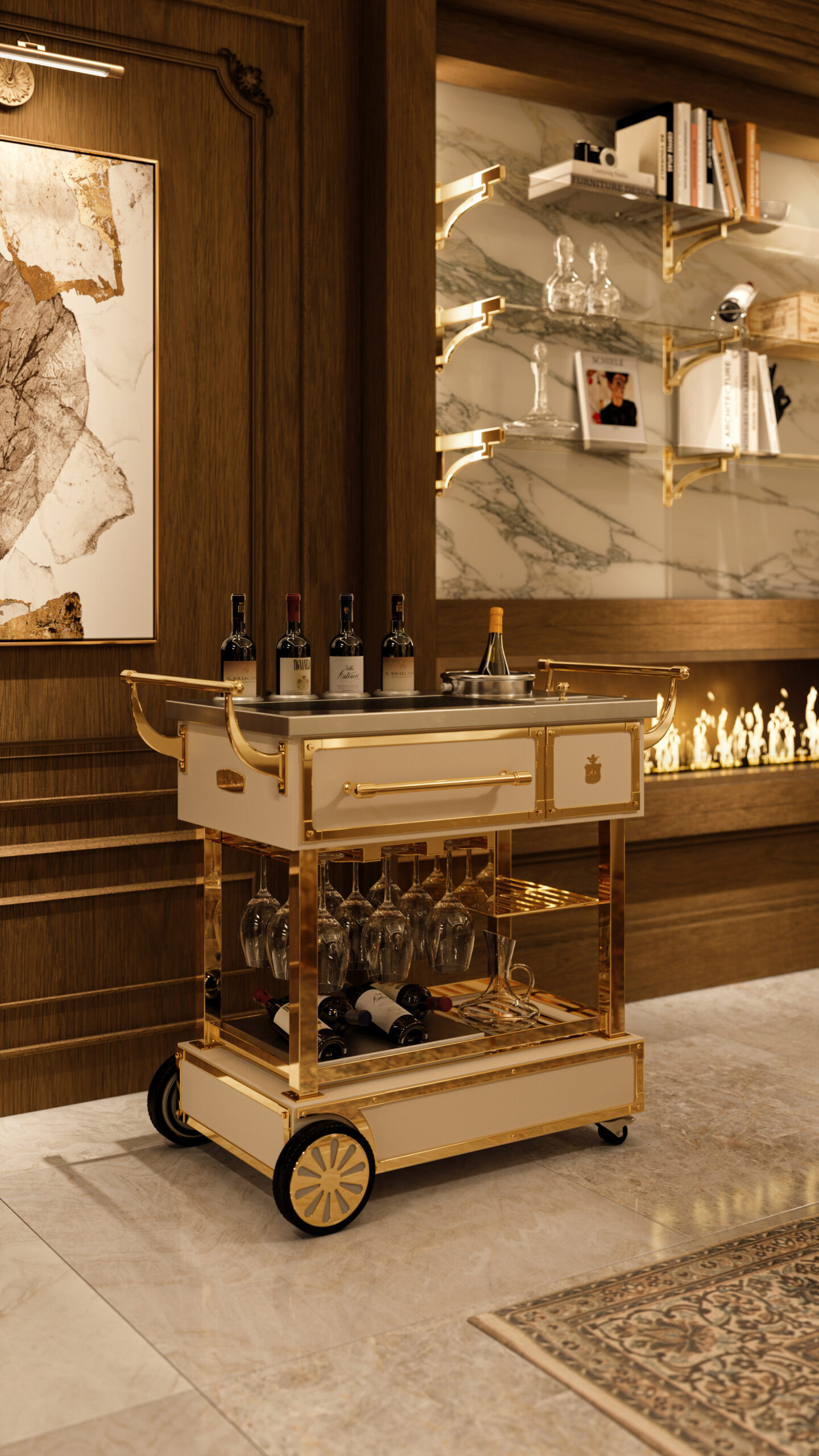 Designed to accompany the presentation and service of wine, the trolley is conceived with great attention to detail and functionality, integrating dedicated spaces for bottles, glass holders, and tasting accessories. Every element contributes to making wine service a refined and curated moment.