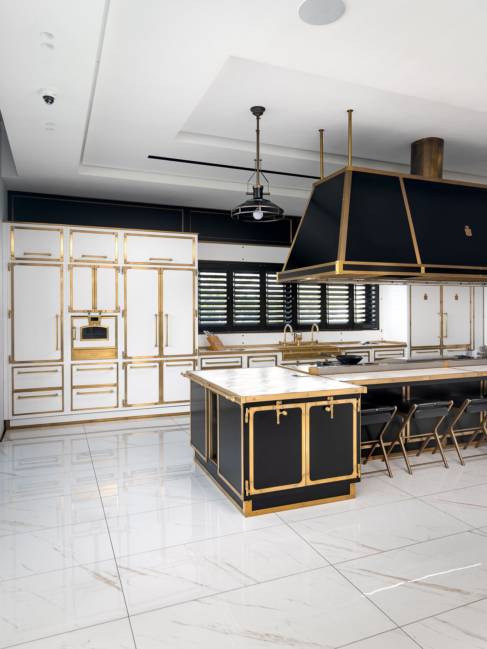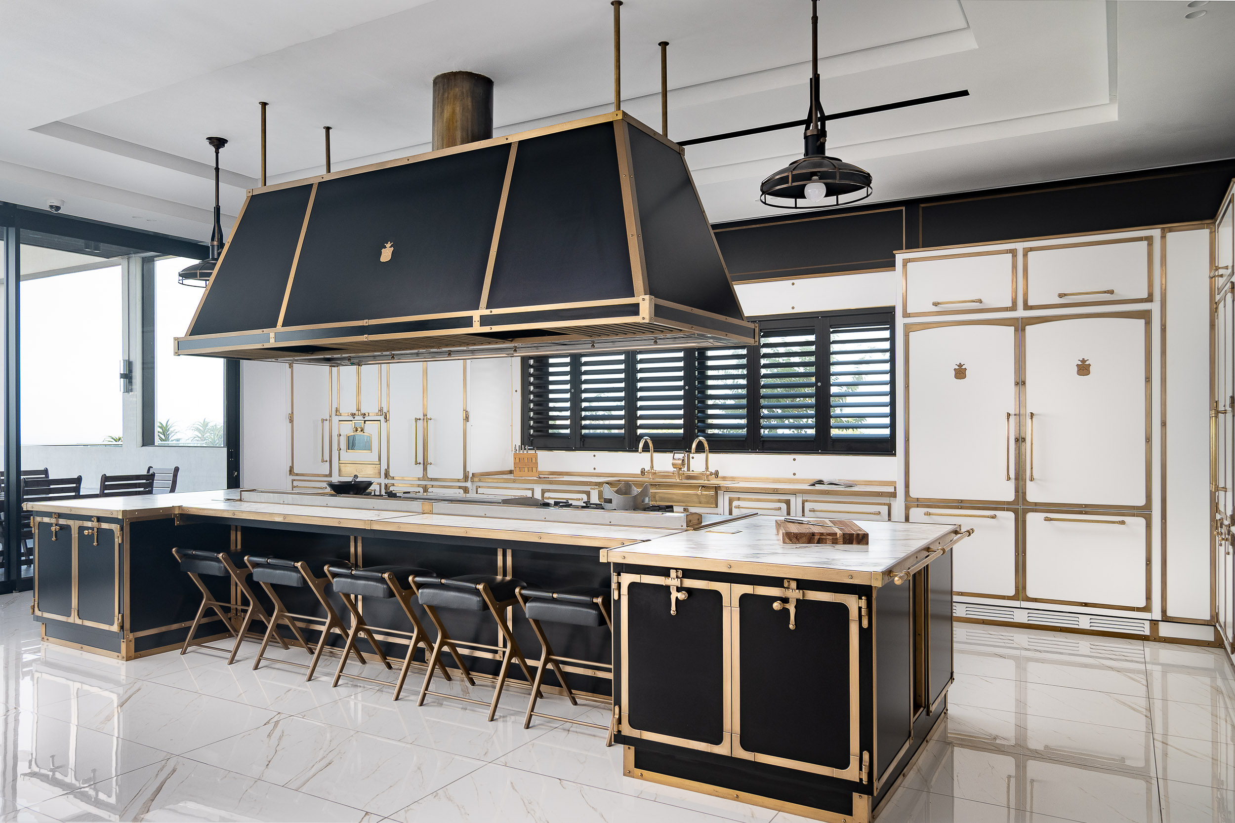 Estructura en acero pintado Obsidiana mate; detalles en latón envejecido; carpintería en roble teñido Lily White; campana piramidal suspendida de acero; encimeras de alto rendimiento.