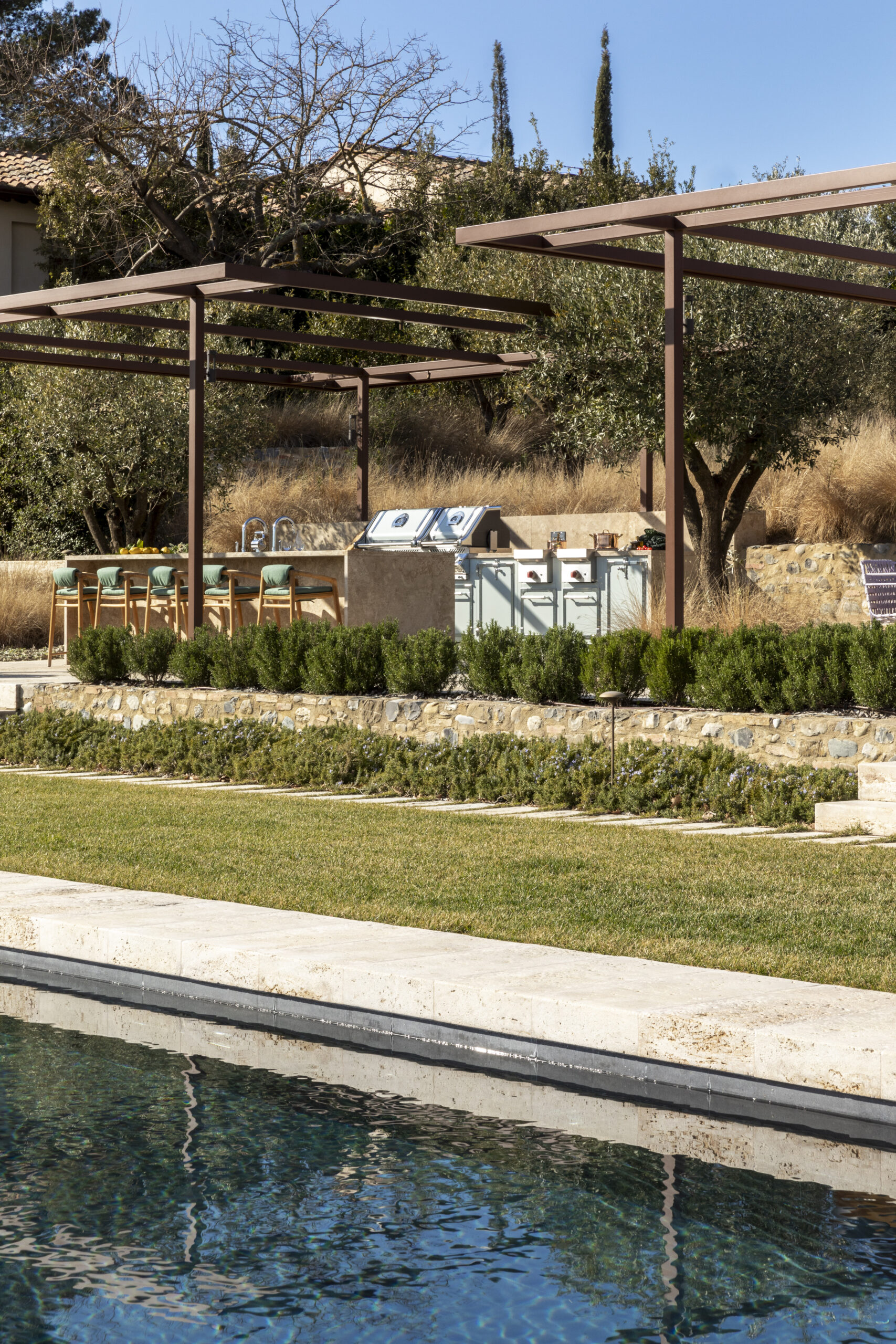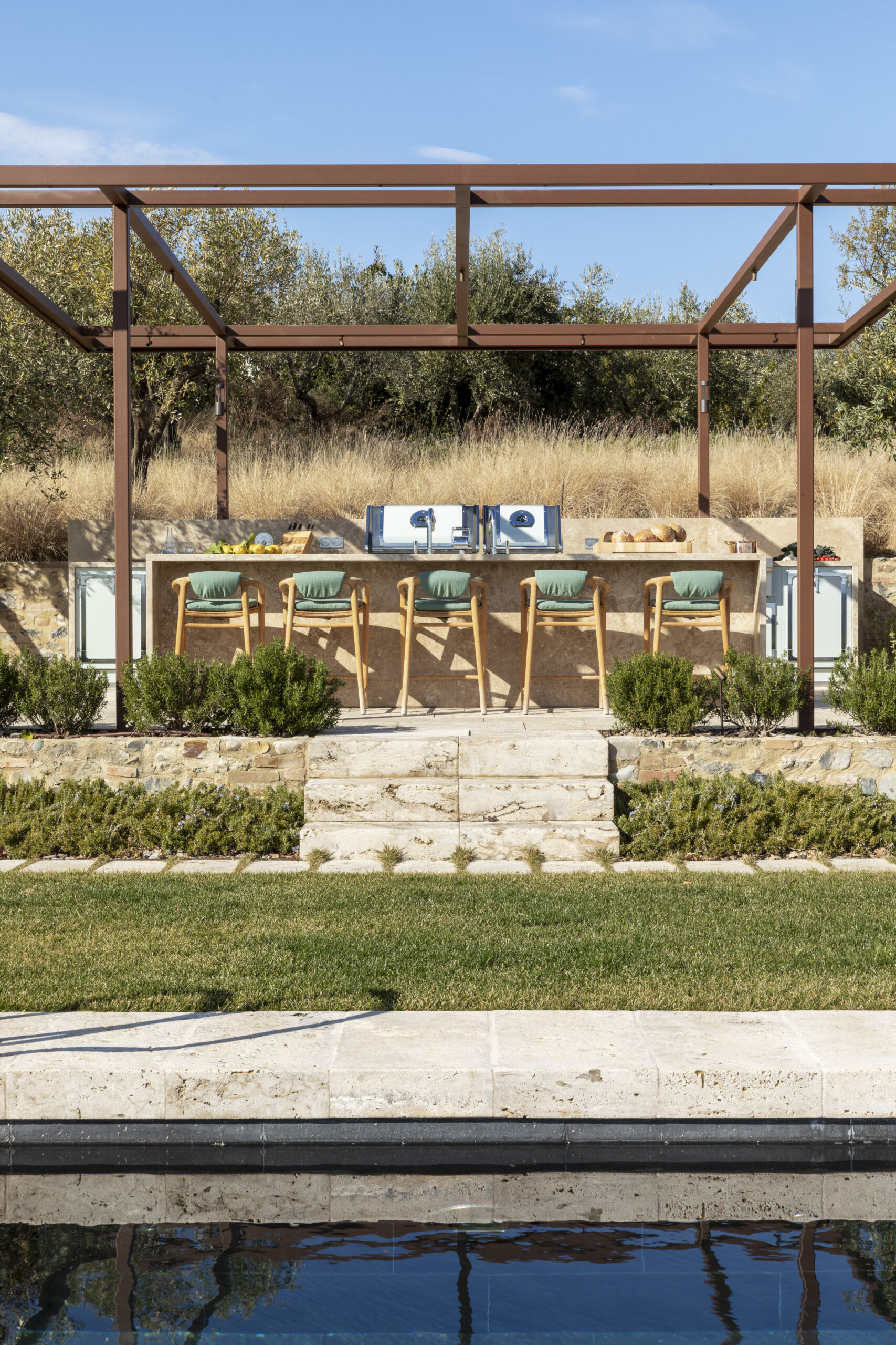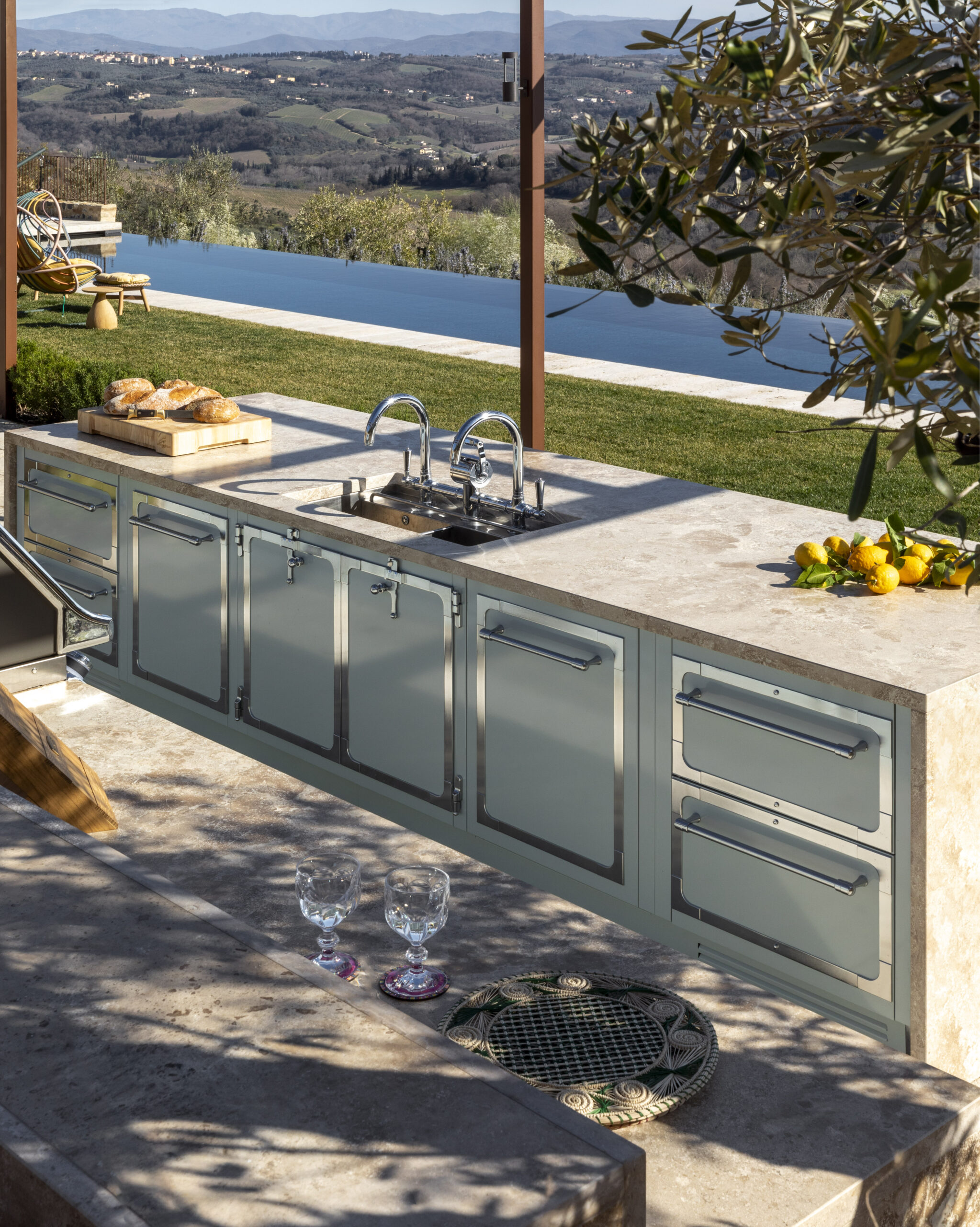 La distribución combina una zona de cocción con doble barbacoa y quemadores tipo sizzle zone, con una isla equipada con fregadero y encimera volada con taburetes. Una cocina que une tecnología, rendimiento y sofisticación, perfectamente adaptada al paisaje toscano.