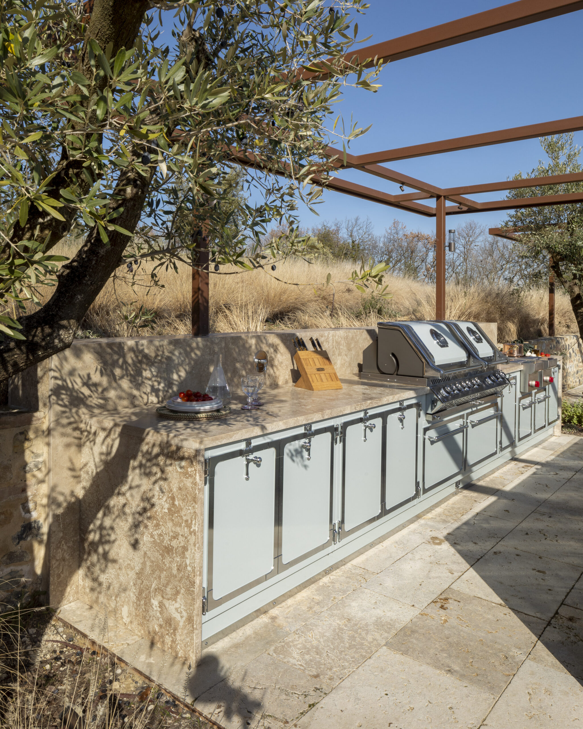 Perfectamente integrada en el entorno natural, la cocina se compone de dos volúmenes paralelos revestidos en mármol travertino, un material noble y con textura que armoniza con la piedra local y los tonos cálidos del paisaje toscano. En su base, el corazón técnico de Officine Gullo: una estructura portante fabricada íntegramente en acero inoxidable AISI 316, específico para exteriores, que garantiza resistencia, durabilidad y prestaciones profesionales, manteniendo una elegancia atemporal.